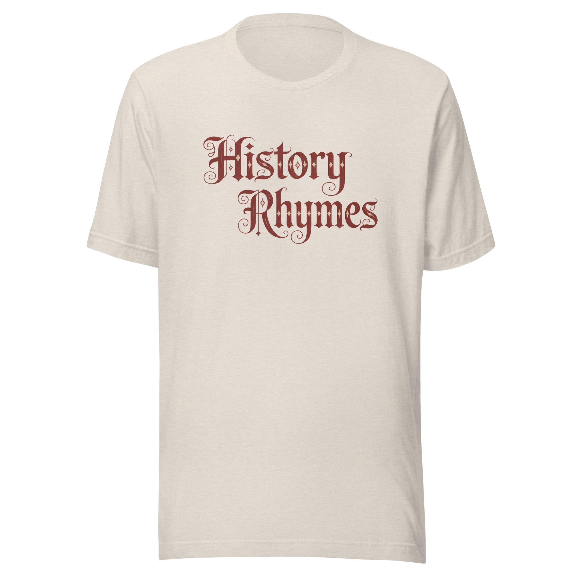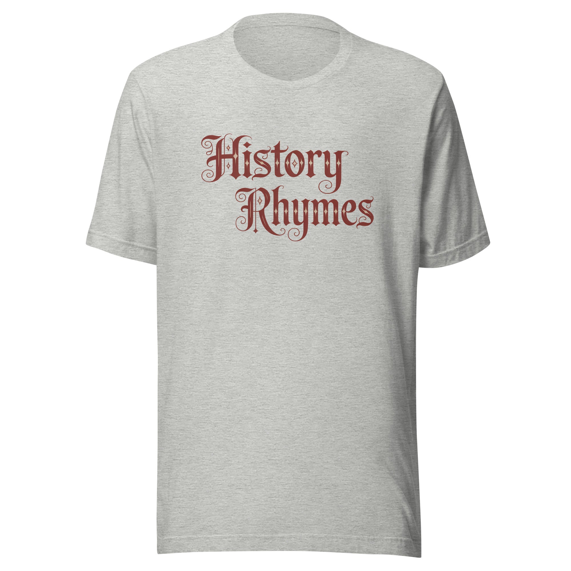 "History Rhymes" is a famous saying (often credited to Mark Twain) meaning history doesn't repeat itself exactly, but similar patterns, events, and human behaviors recur in familiar ways.This t-shirt is everything you've dreamed of and more. It feels soft and lightweight, with the right amount of stretch. It's comfortable and flattering for all.